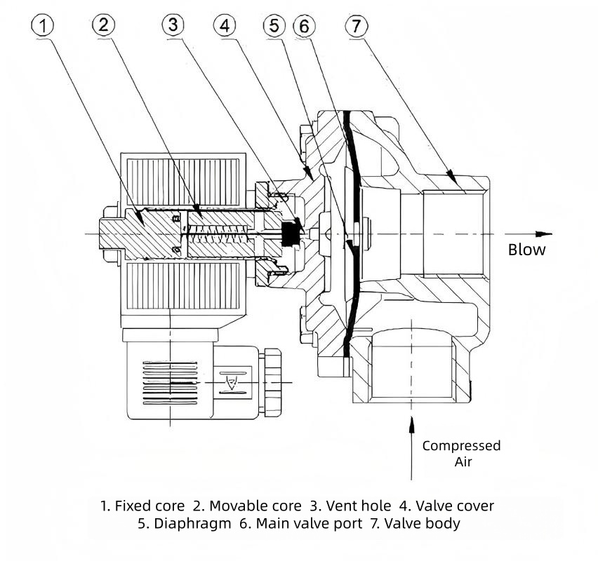 Membranaktivering: Drives av pneumatisk trykkdifferensial. Når den aktiveres, åpner solenoidhodet avlastningsporten for å ventilere trykket i det bakre kammeret, slik at gassen i frontkammeret kan løfte membranen for tilbakeblåsing. Ved avspenning tilbakestilles fjæren for å lukke åpningen, og gjenopprette den forseglede tilstanden.
